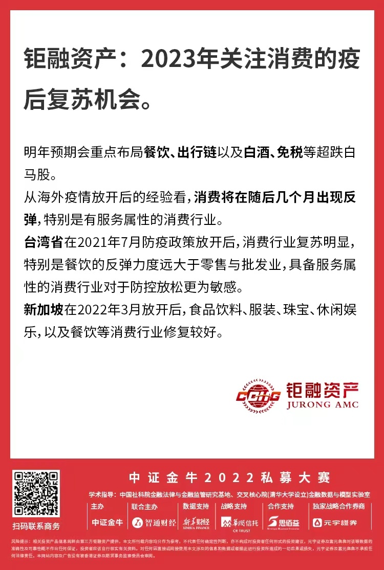 钜融资产指出,从海外疫情放开后的经验看,消费将在随后几个月出现反弹,特别是有服务属性的消费行业。具体来看,台湾省在2021年7月防疫政策放开后,消费行业复苏明显特别是餐饮的反弹力度远大于零售与批发业,具备服务属性的消费行业对于防控放松更为敏感。新加坡在2022年3月放开后,食品饮料、服装、珠宝、休闲娱乐,以及餐饮等消费行业修复较好。