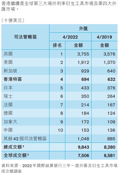 香港外汇交易的平均每日成交额增长9.8%,由2019年4月的6,321亿美元增加至2022年4月的6,944亿美元。人民币交易成交额继续显著上升,人民币外汇交易平均每日成交额由2019年4月的1,076亿美元,增加至2022年4月的1,912亿美元,增幅达77.7%。