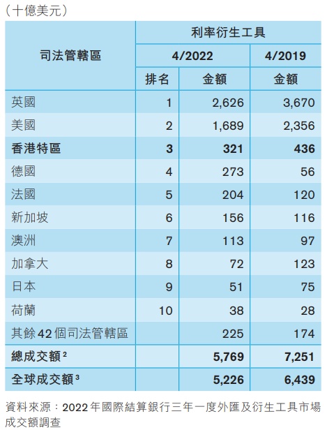 场外利率衍生工具平均每日成交额由2019年4月的4,359亿美元减少至2022年4月的3,211亿美元,减幅为26.3%,原因包括客户需求疲弱,以及自2021年底起停用伦敦银行同业拆息作为参考利率。