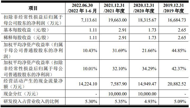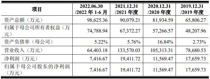 财务方面,于2019年度、2020年度、2021年度及2022年前6个月,公司实现营业收入约为7.87亿元、10.53亿元、13.36亿元及6.44亿元。净利润分别约为1.77亿元、1.16亿元、1.94亿元及7416.67万元。