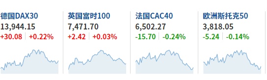2. 截至发稿,德国DAX指数涨0.22%,英国富时100指数涨0.03%,法国CAC40指数跌0.24%,欧洲斯托克50指数跌0.14%。