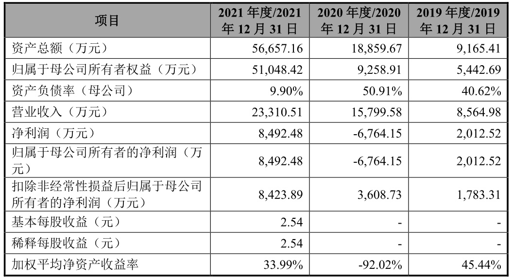 财务方面,于2019年度、2020年度、2021年度,公司实现营业收入约为8564.98万元、1.58亿元、2.33亿元。净利润分别约为2012.52万元、-6764.15万元、8492.48万元。