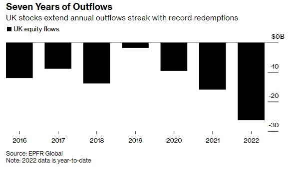 智通财经APP注意到,2022年,英国股市遭遇创纪录的年度资金外流,这是投资者连续第七年逃离英国市场。根据EPFR Global的数据,英国股票基金今年迄今已遭遇263亿美元赎回。与此同时,受国内市场影响较大的基准指数富时250指数(FTSE 250 Index)暴跌20%,为2008年以来最大跌幅。富时100指数(FTSE 100 Index)上涨逾1%,主要原因是其持有的大宗商品类股大幅上涨。