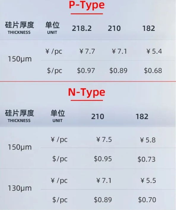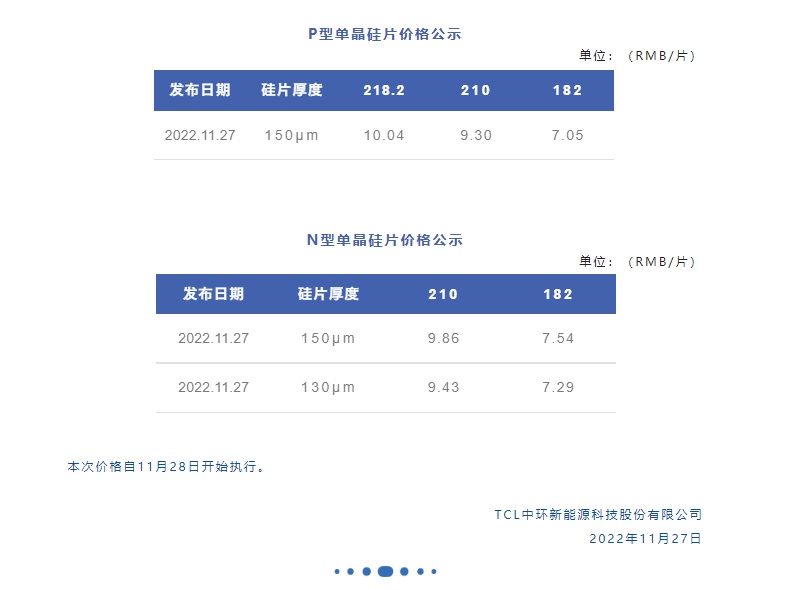 智通财经APP获悉,12月23日消息,TCL中环(002129.SZ)大幅下调单晶硅片价格,降幅超23%。TCL中环公示,150μm厚度P型210、182硅片报价分别为7.1元/片、5.4元/片,较11月27日报价分别大幅下调2.2元、1.65元。150μm厚度N型210、182硅片报价分别为7.5元/片、5.8元/片,较11月27日报价分别大幅下调2.36元,1.74元。同日,隆基绿能(601012.SH)也公示下调公司单晶硅片价格,“单晶硅片P型M6 150μm厚度(166/223mm)”价格报4.54元,“单晶硅片P型M10 150μm厚度(182/247mm)”价格报5.40元。