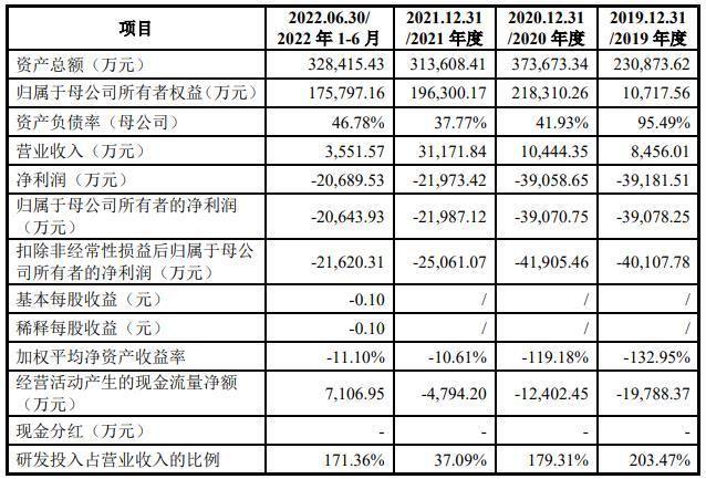 财务方面,于2019年度、2020年度、2021年度及2022年前6个月,公司实现营业收入约为8456.01万元、1.04亿元、3.12亿元及3551.57万元;同期,研发投入占营业收入的比例分别为203.47%、179.31%、37.09%及171.36%。