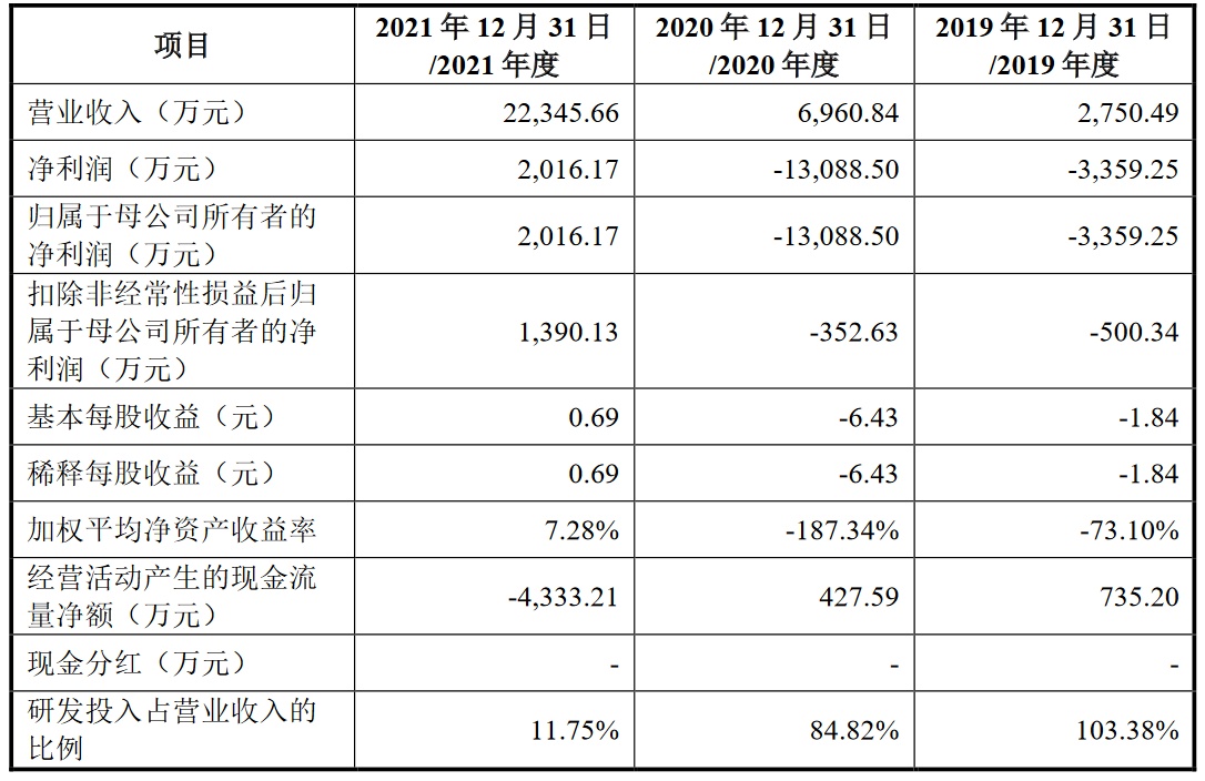 财务方面,于2019年度、2020年度、2021年度,公司实现营业收入约为2750.49万元、6960.84万元、2.23亿元。净利润分别约为-3359.25万元、-1.31亿元、-2016.17万元。