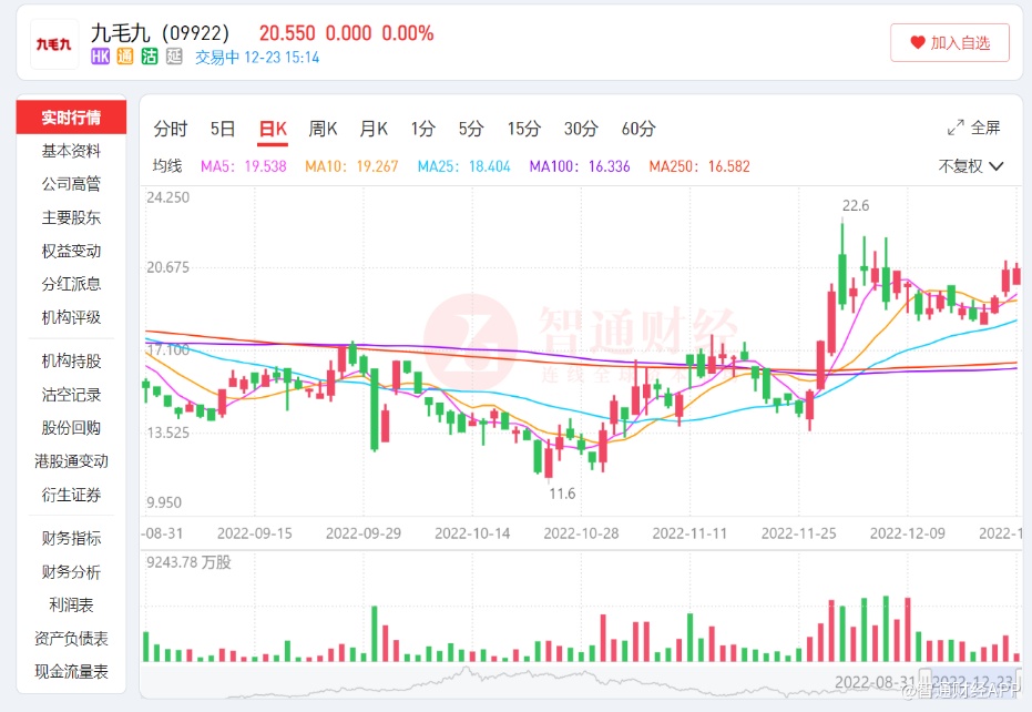 智通财经APP注意到,九毛九股价自11月28日开始出现连续大幅上涨,整个11月股价上涨近6成。12月8日,九毛九发布公告称,当日,公司董事会主席、CEO兼控股股东管毅宏通过场外大宗交易方式向一名独立机构买方出售合共4800万股公司股份。这则公告仅令公司股价调整数日便重拾升势,12月仍延续上涨走势。