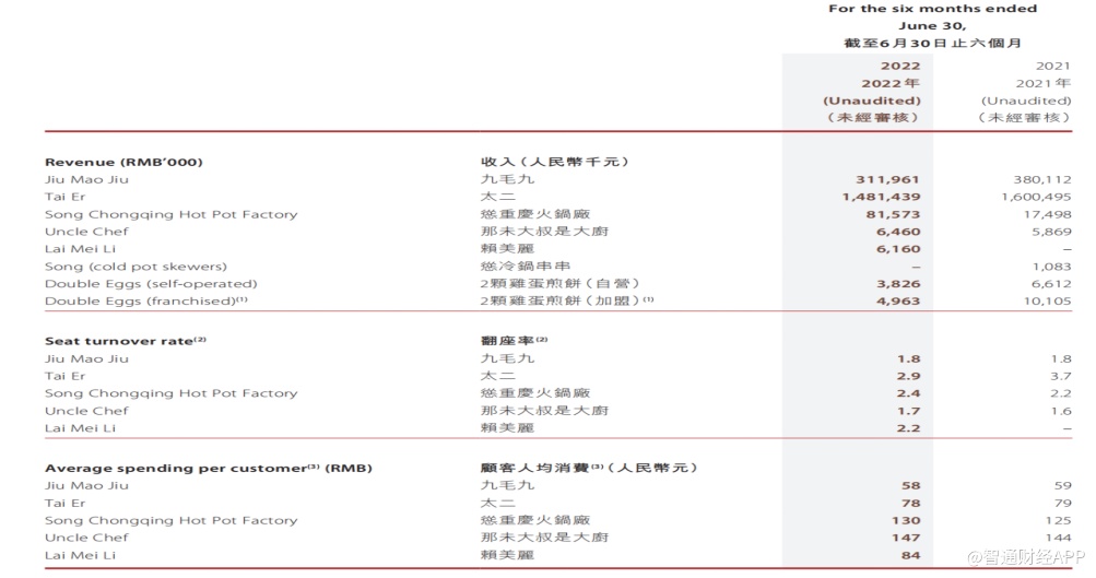 公司披露的翻台率数据显示,太二翻台率从2018年的4.9次/天下滑至2021年的3.4次/天,2022年上半年进一步下滑至2.9次/天,隐隐透露增长疲惫的迹象。好在,即便是3次/天的翻台数据,在餐饮市场也是“能打”的存在,这也是九毛九增设太二门店的驱动力。