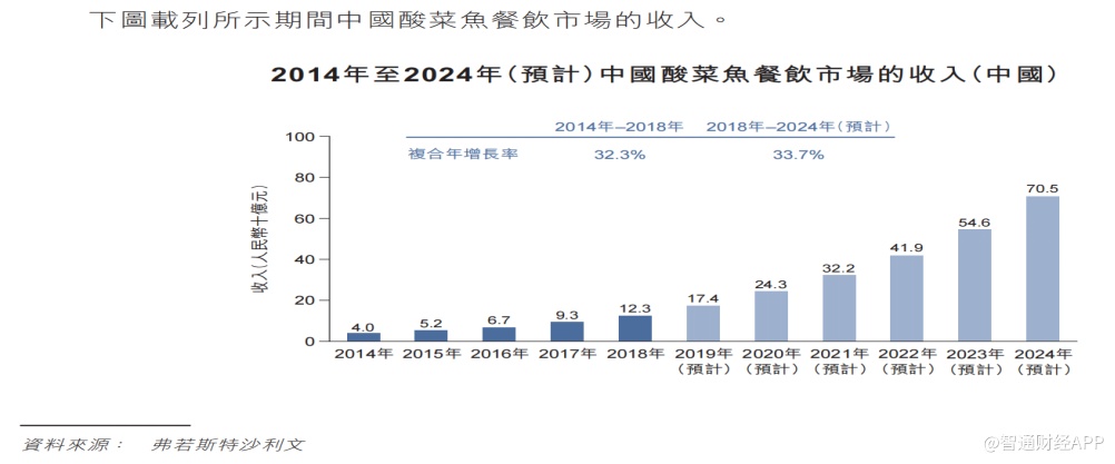 根据弗若斯特沙利文报告,2018年,中国酸菜鱼餐饮市场总收入为123亿元,太二当年以5.4亿元收入占据中国酸菜鱼餐厅头名,市场份额为4.4%。弗若斯特沙利文曾预测,不考虑疫情影响的情况下,预计2024年中国酸菜鱼餐饮市场的收入将达到705亿元,这将给太二提供充裕的扩张空间。