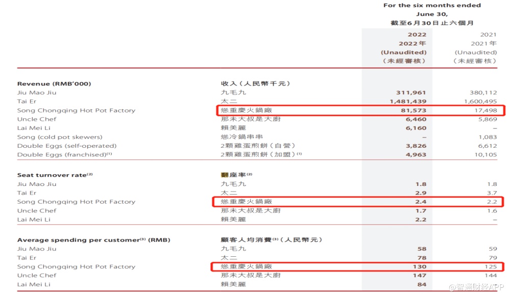 2020年8月公司推出“怂”重庆火锅厂切入火锅赛道。与太二目标客群相同,锁定年轻消费,怂火锅开业不到4个月后,在12月单月营业额突破200万元。2021年上半年,3家“怂”火锅门店贡献了1750万元的收入,2022年上半年,“怂”火锅凭11家门店就实现超过8000万元的收入。此外,“怂”火锅的翻台率在上半年达到2.4次/天,同比提升0.2次/天,客单价达到130元,同比提升5元。