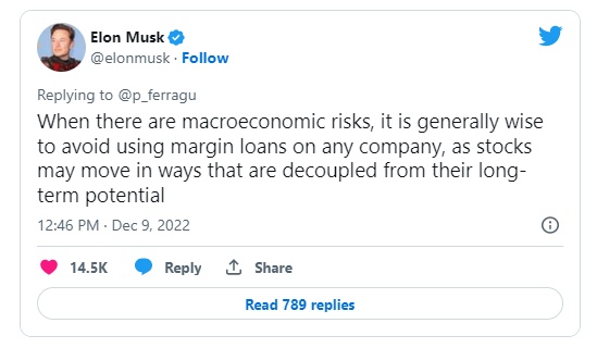 这是马斯克本月至少第二次发出警告,具有讽刺意味的是,这位亿万富翁此前已抵押其特斯拉股票。根据美国证券交易委员会在2022年4月提交的一份文件,截至2020年12月,马斯克有9200万股特斯拉股票作为抵押。