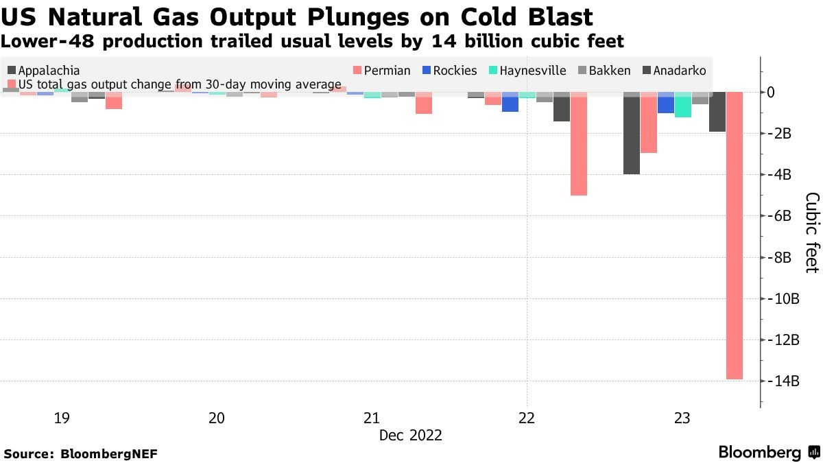 这场冬季风暴还导致了美国天然气产量骤降。上周五,美国天然气产量遭遇了十多年来最大单日跌幅,原因是天然气管道中液体结冰,迫使油井关闭。根据数据显示,随着包括德克萨斯州在内的主要产区气温降至零度以下,美国南部48个州的供应量比前一天减少了近100亿立方英尺,约10%。