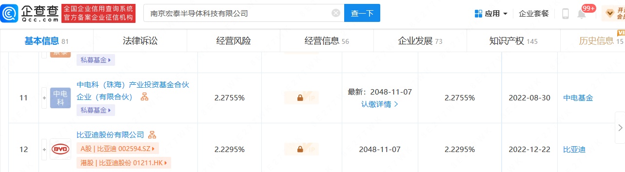 智通财经APP获悉,企查查APP显示,近日,南京宏泰半导体科技有限公司(下称:宏泰半导体)发生工商变更,新增股东比亚迪股份有限公司,持股约2.23%。据公开资料显示,宏泰半导体成立于2018年11月,法定代表人为包智杰,注册资本约5549.1万人民币,经营范围含半导体、仪器仪表、自动化成套控制装置系统研发、制造、销售;集成电路开发、销售、技术服务;光电设备研发等。