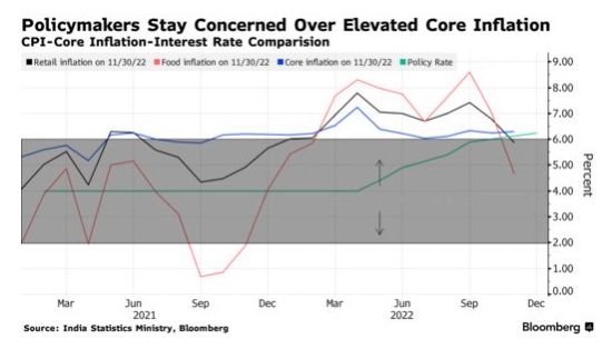 政策制定者发表上述言论之前,已将注意力集中在核心通胀上升、消费者价格有所放缓的情况。剔除波动较大的食品和能源价格后计算的印度核心通胀率已连续14个月保持在6%以上,而11月份零售通胀率降至5.88%。