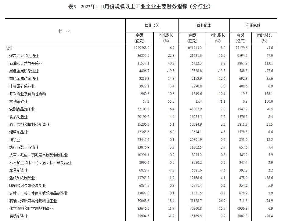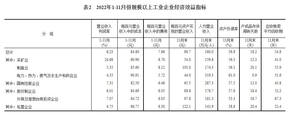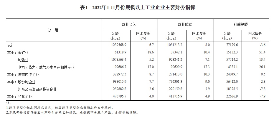 2022年1—11月份全国规模以上工业企业利润下降3.6%
