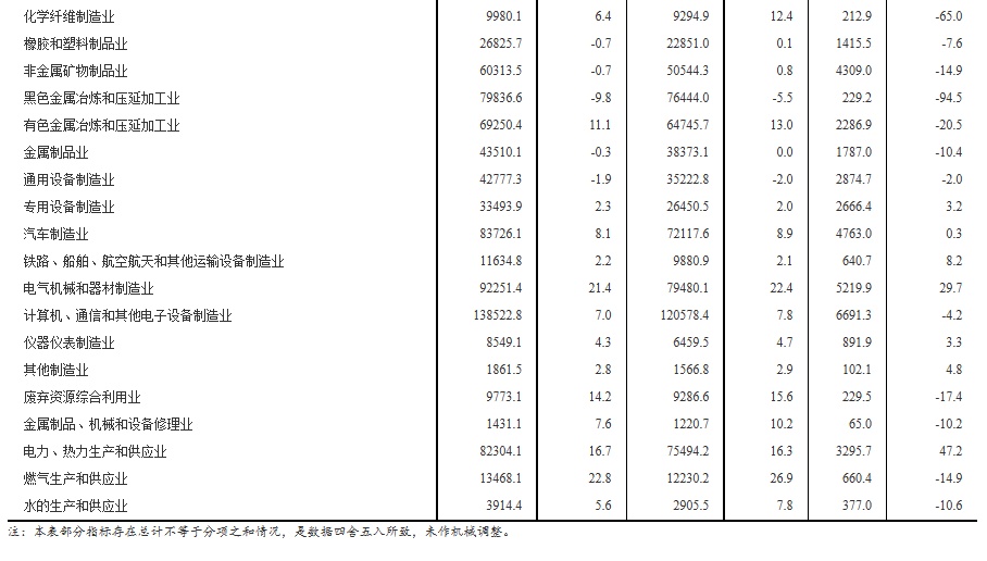 1—11月份,在41个工业大类行业中,20个行业利润总额同比增长,21个行业下降。主要行业利润情况如下:石油和天然气开采业利润总额同比增长1.13倍,电力、热力生产和供应业增长47.2%,煤炭开采和洗选业增长47.0%,电气机械和器材制造业增长29.7%,专用设备制造业增长3.2%,汽车制造业增长0.3%,农副食品加工业下降0.5%,通用设备制造业下降2.0%,计算机、通信和其他电子设备制造业下降4.2%,化学原料和化学制品制造业下降6.9%,非金属矿物制品业下降14.9%,纺织业下降18.2%,有色金属冶炼和压延加工业下降20.5%,石油、煤炭及其他燃料加工业下降74.9%,黑色金属冶炼和压延加工业下降94.5%。