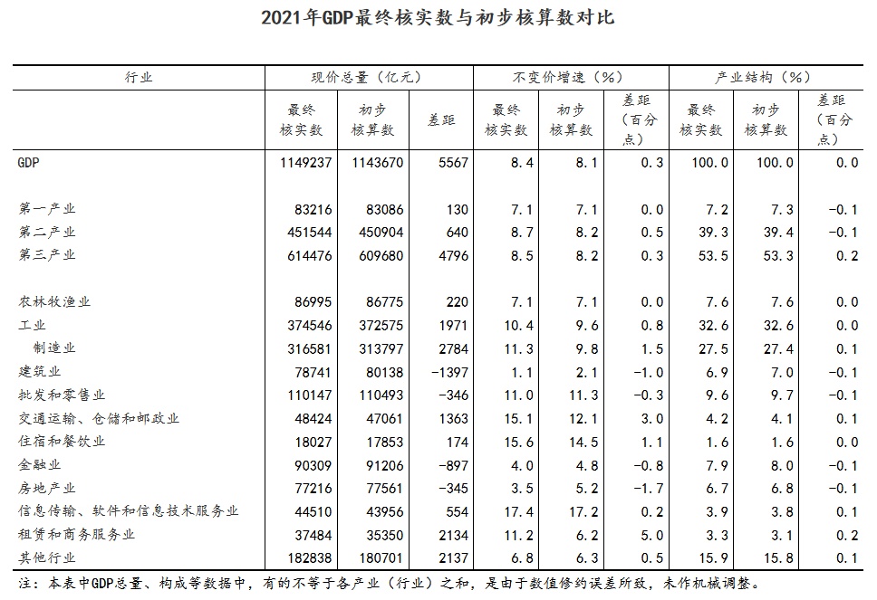 智通财经APP获悉,12月27日,国家统计局关于2021年国内生产总值最终核实的公告。经最终核实,2021年,GDP现价总量为1149237亿元,比初步核算数增加了5567亿元;按不变价格计算,比上年增长8.4%,比初步核算数提高0.3个百分点。