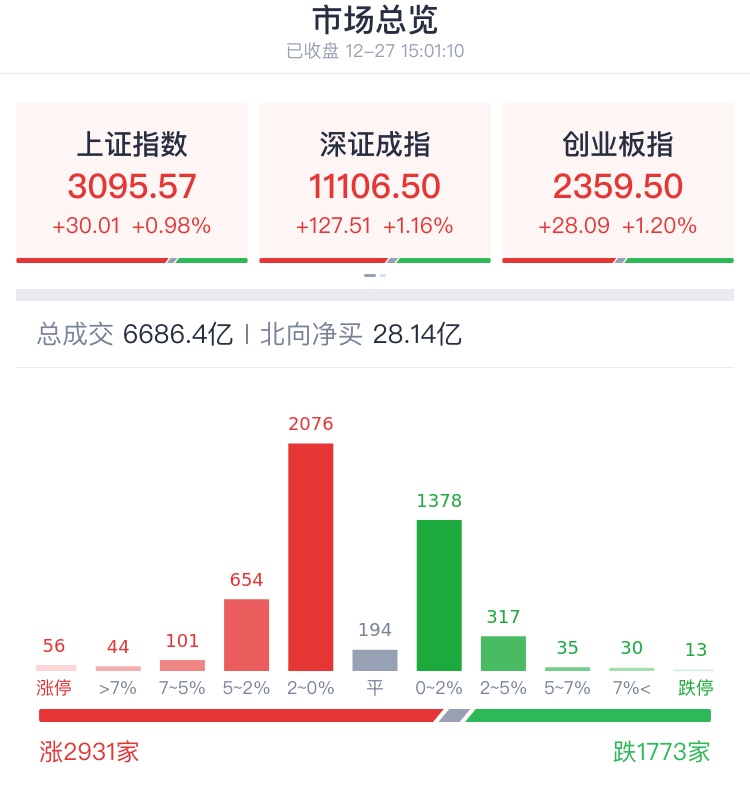 总体上,个股涨多跌少,上涨超2900家,两市全天成交额超6686亿元,今日北向资金暂停交易。