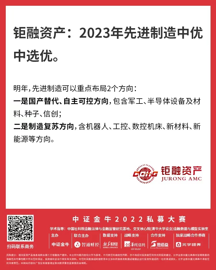智通财经APP获悉,由元宇证券独家战略支持的中证金牛2022私募大赛于12月1日正式启动,赛事正如火如荼开展。近期不少参赛机构研究团队及产品主理人就市场走势和行业展望发表真知灼见。中海外钜融资产管理集团有限公司指出,明年,先进制造业可以重点布局两个方向:一是国产替代、自主可控方向,包含军工、半导体设备及材料、种子、信创;二是制造复苏方向,含机器人、工控、数控机床、新材料、新能源等方向。
