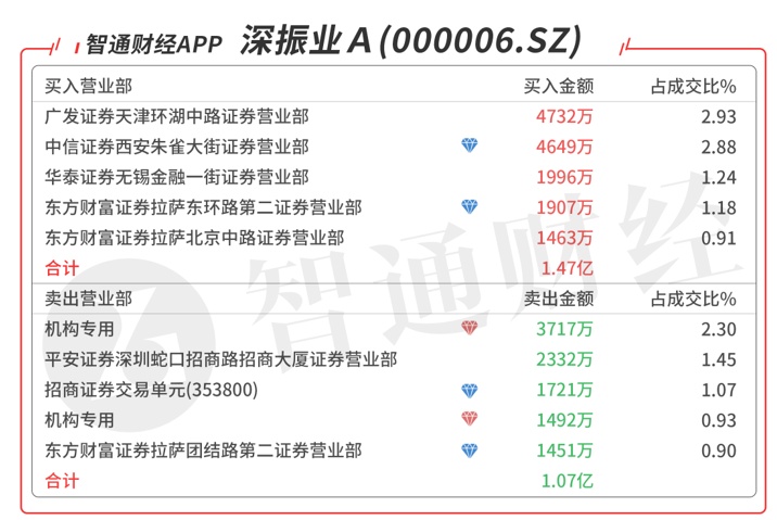 深振业A(000006.SZ):多主力现身龙虎榜,机构与游资出现分歧,机构席位对倒卖出3179万元,买二是顶级游资方新侠的席位买入4649万元,买三是知名游资苏南帮的席位买入1996万元,当日净买入7285万元,该股近期持续放量,有望冲击前期高点。