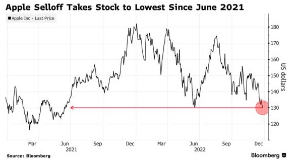 该股连续第三个交易日下跌1.4%。虽然苹果公司在2022年的表现仍略好,跌幅为27%,低于纳斯达克100指数34%的跌幅,但在过去一个月里,苹果公司的表现落后于科技股为主的指数。