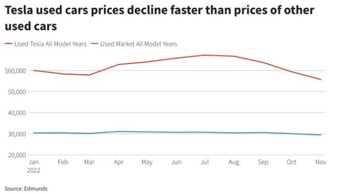 随着燃油价格逐渐趋于缓和、利率上升、特斯拉产量增加、以及新能源电动汽车行业竞争加剧,导致特斯拉二手车的价格下跌速度快于市场的平均水平,对新特斯拉价格影响也产生了连锁反应。