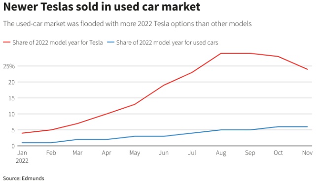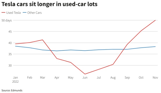 行业数据显示,特斯拉二手车的价格下降速度正快于其他汽车制造商。根据Edmunds的数据,11月份特斯拉二手车的平均成交价格为约5.58万美元,比7月份的峰值6.73万美元下降了17%。整个二手车市场的平均价格在此期间下降了4%。11月份二手特斯拉在经销商库存中的平均库存时间为50天,而所有品牌二手车的平均库存时间为38天。