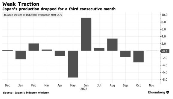 智通财经APP获悉,日本11月工厂产出连续第三个月萎缩,海外需求降温导致生产水平进一步低于疫情前水平。