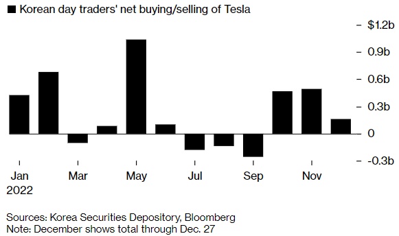智通财经APP获悉,特斯拉(TSLA.US)创下有史以来最差的股价表现之际,韩国散户投资者今年已净买入价值28亿美元的特斯拉股票。根据韩国证券存管所的数据,截至12月27日,即使特斯拉在12月暴跌44%,股价表现为有史以来最糟糕的一个月,该国日间交易员仍于本月增持了1.6亿美元的该公司股票,连续第三个月实现净买入。