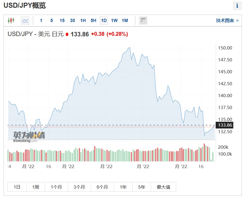 智通财经APP获悉,周三,美元兑日元汇率攀升至一周多高点,截至发稿,美元兑日元汇率涨0.28%,报133.86;该汇率日内早些时候触及134.40,为12月20日以来首次。