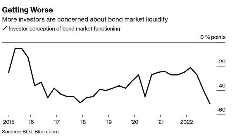 日本央行本月早些时候进行的一项调查显示,投资者对日本债券市场的流动性信心跌至历史低点。在10月和12月的会议期间,日本央行锚定的10年期债券也连续四天未能实现交易,这表明市场流动性枯竭。