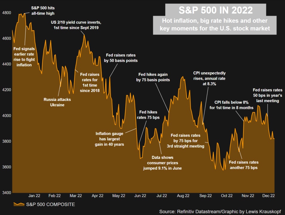 智通财经APP获悉,美股投资者非常渴望残酷的2022年赶紧过去。在美联储大举加息以抑制40年来最严重的通胀的情况下,今年迄今为止,标普500指数下跌了近20%,在距离今年结束仅剩几个交易日的情况下,这有望成为2008年以来的最大年度跌幅。
