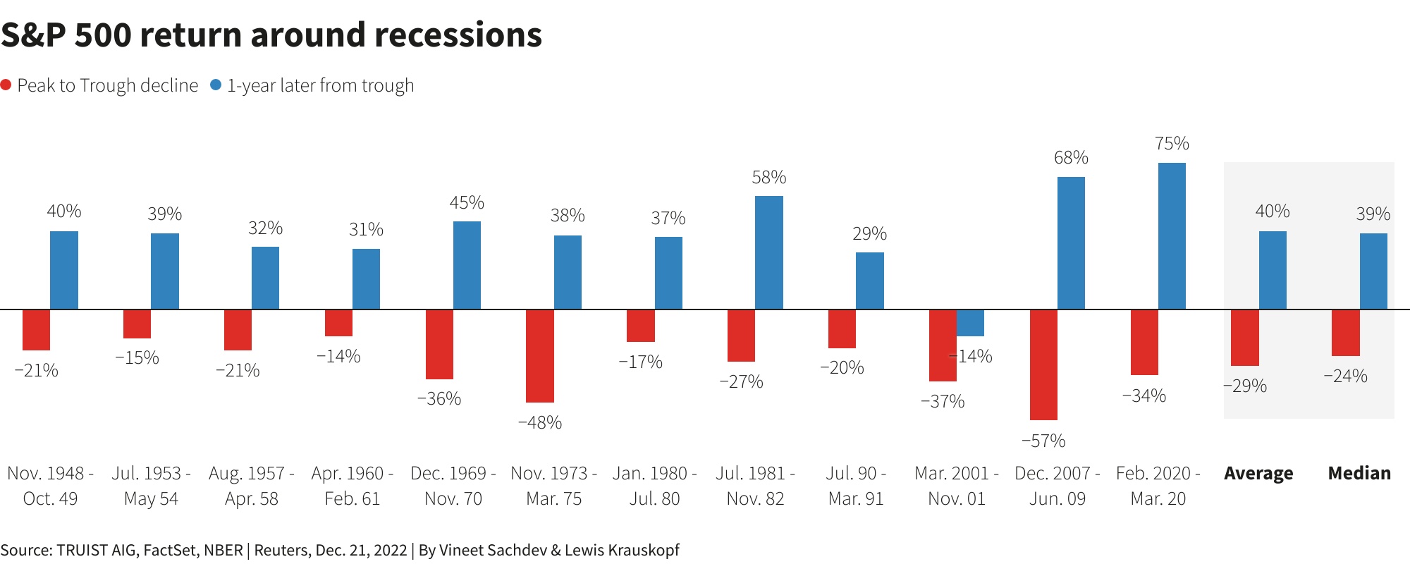 经济衰退往往会对股市造成沉重打击。根据Truist Advisory Services的数据,二战以来,标普500指数在经济衰退期间平均下跌29%。不过,值得一提的是,股市在这些下跌之后通常会出现强劲反弹。