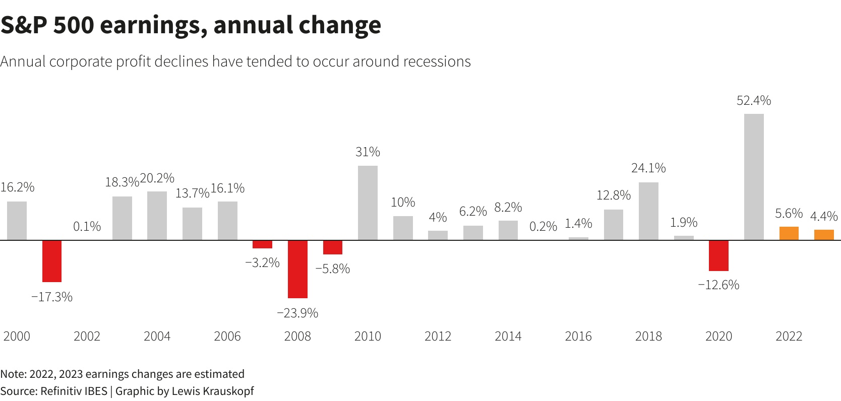 投资者还担心,当前的企业盈利预期可能没有完全计入潜在的经济衰退,这给股市留下了更多下行空间。根据Refinitiv IBES的数据,分析师普遍预计标普500指数成分股的每股收益到2023年将增长4.4%。然而,根据Ned Davis Research的数据,在经济衰退期间,标普500指数成分股的每股收益的年均降幅为24%。