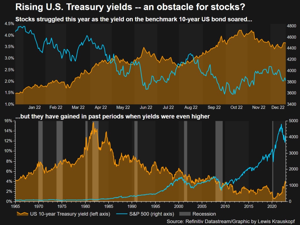 2023年即将到来,通胀以及美联储遏制通胀的积极程度可能仍将是左右股市表现的关键因素。同时,投资者也将关注美联储收紧货币政策会对经济产生怎样的影响,以及这是否会让其他资产比股票更具竞争力。