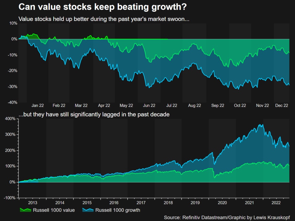 过去一年,价值股——通常被定义为那些在账面价值或市盈率等指标上有折让的股票——的表现好于科技股和其他成长股,这扭转了过去10年大部分时间里一直存在的趋势。收益率上升以及对利润增长的质疑将对科技股和成长股构成压力,但问题在于,价值股(更多由金融、能源和防御类股)是否可能在新的一年里再度跑赢大盘?
