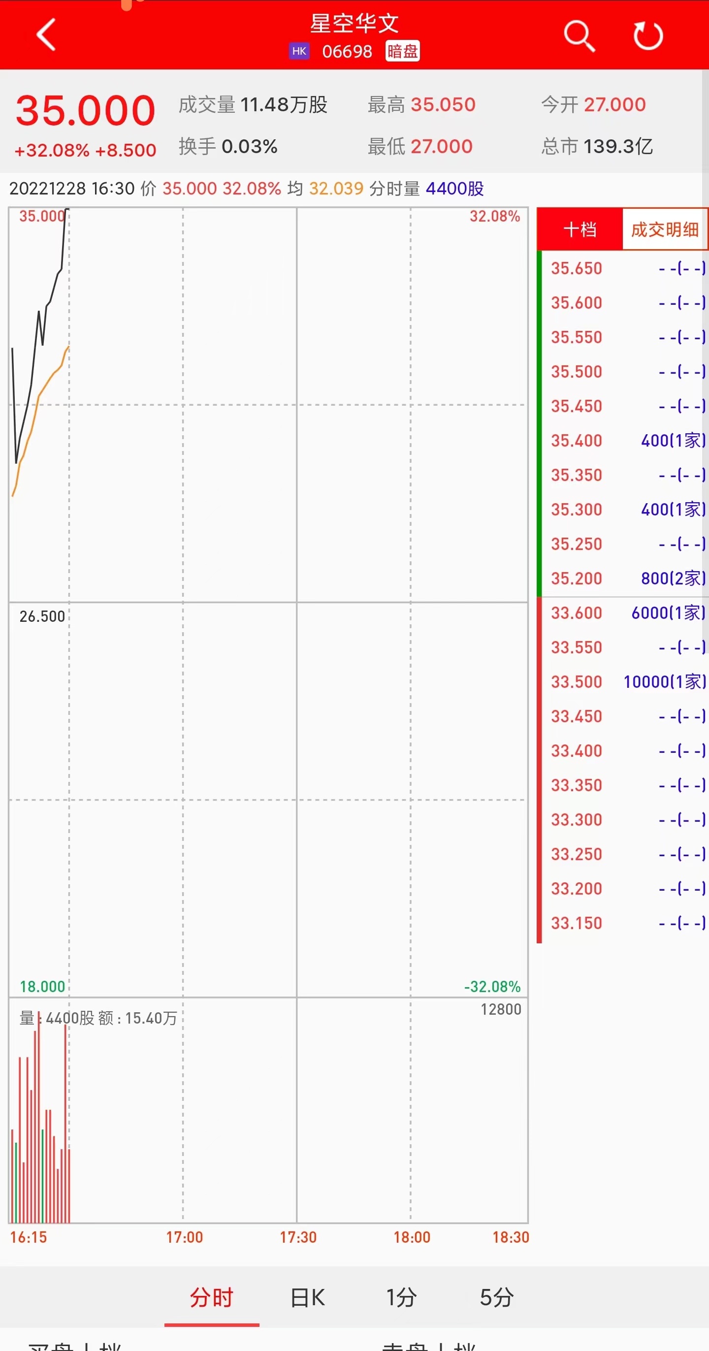 智通财经APP获悉,星空华文(06698)将于12月29日(周四)在香港挂牌。截至发稿,利弗莫尔证券暗盘交易显示报价35.00港元,较招股价26.50港元涨32.08%。每手400股,不计手续费,每手赚3400港元。