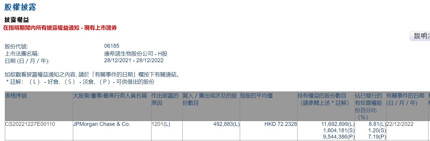 智通财经APP获悉,香港联交所最新资料显示,12月22日,小摩减持康希诺生物(06185)49.2883万股,每股作价72.2328港元,总金额约为3560.23万港元。减持后最新持股数目约为1169.29万股,最新持股比例为8.81%。