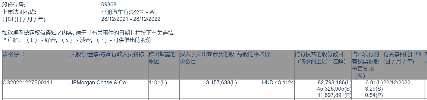 智通财经APP获悉,香港联交所最新资料显示,12月22日,小摩增持小鹏汽车-W(09868)345.7638万股,每股作价43.1124港元,总金额约为1.49亿港元。增持后最新持股数目约为8279.82万股,最新持股比例为6.01%。