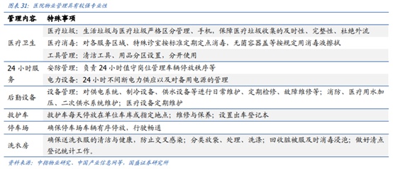 而医院物业专业性极强,包含了医疗卫生、24小时服务、后勤设备管理、救护车、停车场、洗衣房等服务,由于医院容易发生人员伤害、院内交叉感染和群体事件,医院物业管理具备明显的专业性和特殊性;医院新建楼宇规模庞大、建筑复杂、设备设施先进,较强的资源整合能力与管控能力。