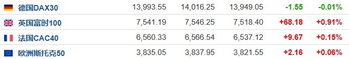 2. 截至发稿,德国DAX指数跌0.01%,英国富时100指数涨0.91%,法国CAC40指数涨0.15%,欧洲斯托克50指数涨0.06%。