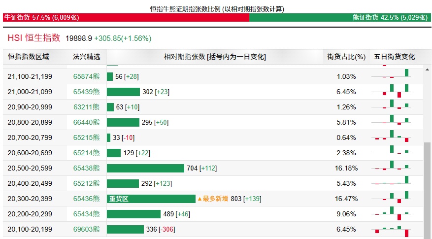 法兴恒指牛熊证街货分布图中的数据显示,熊证街货重货区在20300-20399区间,该区间最新熊证数量为803张,较上一交易日增加139张;最多新增也落在这一区间。