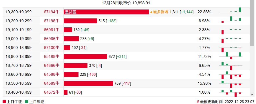 牛证街货重货区在19300-19399区间,该区间最新牛证数量为1311张,较上一交易日增加1144张;最多新增在同一区间。