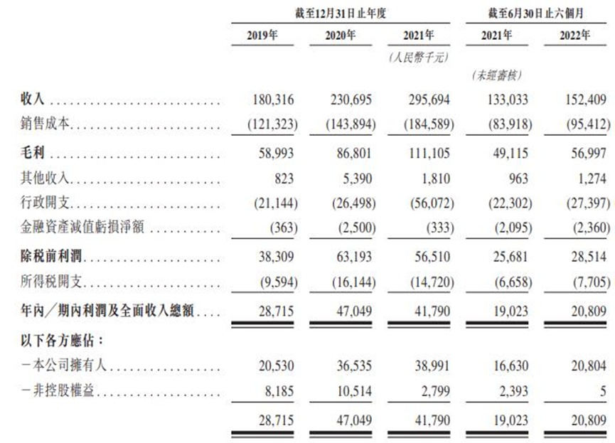 财务方面,2019年、2020年、2021年及截至2022年6月30日止6个月,公司的收入分别约为1.80亿元(人民币,下同)、2.31亿元、2.96亿元及1.52亿元;同期,年内利润分别约2871.5万元、4704.9万元、4179.0万元及2080.9万元。