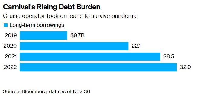 与其他船舶运营商一样,这家邮轮巨头因新冠疫情而停运了一年多。在过去三年里,该公司发行了新股并大举借款,导致长期债务增加了两倍,达到320亿美元。而不断上升的利率使得这笔款项更难偿还。