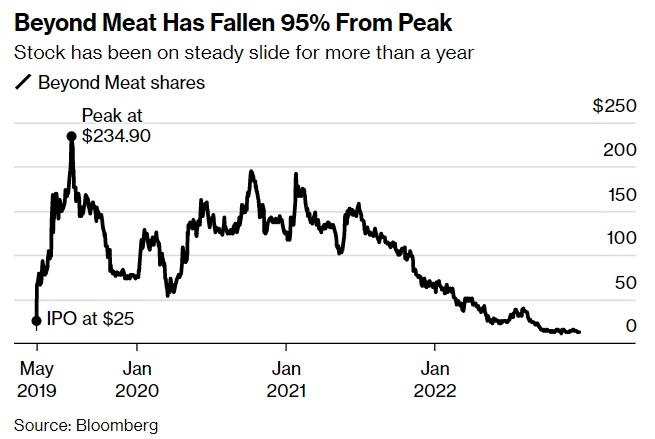 另外,首席执行官Ethan Brown坚持认为,植物性肉类最终将取代真正的肉类。但投资者远未被说服:该股已较2019年的峰值下跌约95%,空头头寸约占可交易股票的40%。如果没有出现重大转机,这家公司能存活多久可能都是一个问题。