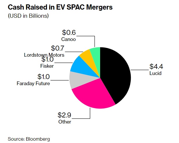电动汽车初创公司在2020年和2021年通过与特殊目的收购公司(SPAC)合并上市,筹集了超过100亿美元资金。