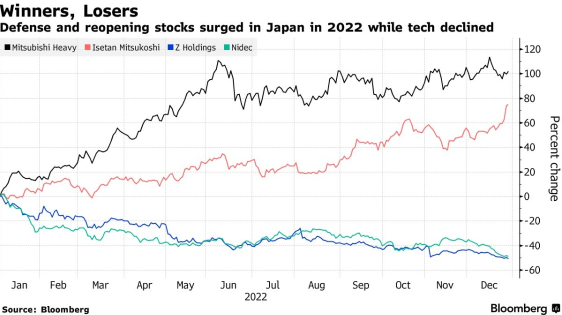 智通财经APP获悉,由于投资者担心全球经济衰退和货币政策收紧,互联网和半导体类股下跌,同时,因全球地缘政治紧张局势加剧,国防承包商的股价有所攀升,百货商店运营商也从更宽松的疫情限制中受益。因此,国防股和重新开放概念股的上涨抵消了科技股的下跌,帮助日本股市避免了今年全球同行的大幅下跌。