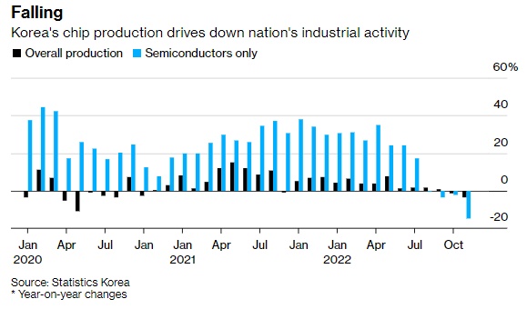 智通财经APP获悉,韩国11月份半导体产量出现自全球金融危机以来的最大降幅,拖累了该国工业产出,并表明随着全球经济放缓,海外对科技零部件的需求进一步降温。