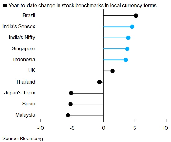 智通财经APP获悉,尽管美元汇率的走强一定程度上影响了亚洲地区股市的投资吸引力,但该地区的三个股票市场(印度尼西亚、印度和新加坡)正竞相成为今年全球涨幅最大的股市。数据显示,印度尼西亚、印度和新加坡的指数变化接近巴西的Ibovespa指数涨幅,后者以当地货币计算,该指数上涨了5.2%。而其他亚洲股市各有上涨至少3.5%,仅单日的涨幅变化即可弥补其他地区市场之间的涨幅差额。尽管亚洲各国股票市场收益有所不同,但按美元计算,排名基本相似。